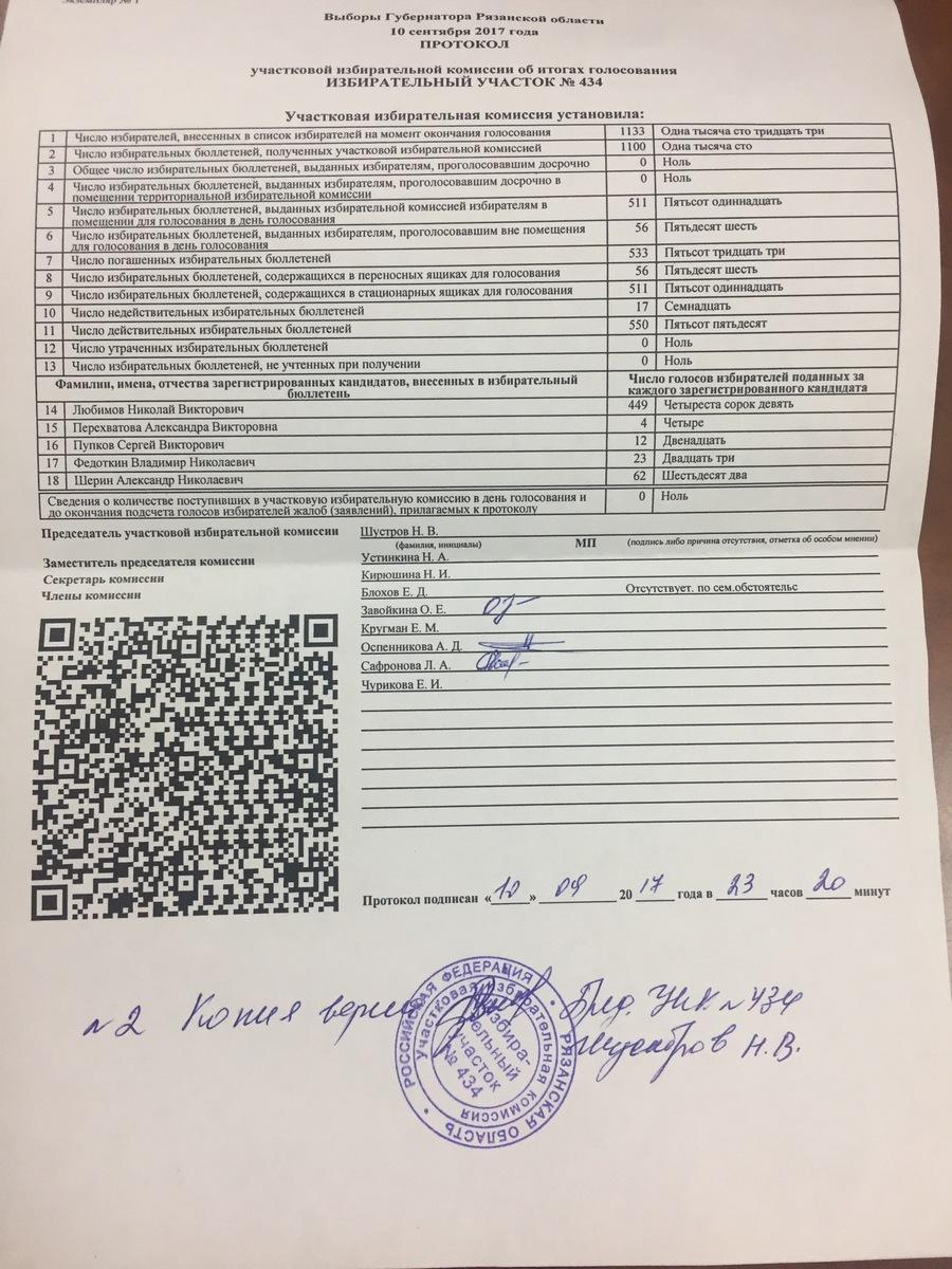Сообщение № 39140. Рязанская область, Рязанский район, с. Дубровичи, УИК № 434. Наблюдателю выдали копию протокола об итогах голосования, не указав там дату и время выдачи копии. Кроме того, непонятно количество подписей членов комиссии под протоколом.