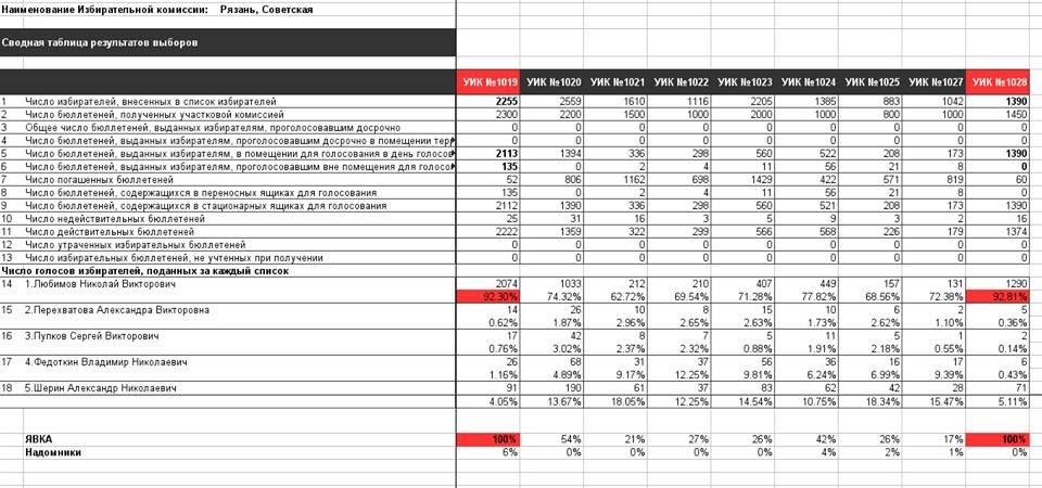 Исключением стали участки, где голосовали курсанты Рязанского высшего воздушно-десантного командного училища имени генерала армии В. Ф. Маргелова. Там явка составила 100%, а по результатам подсчета голосов Николай Любимов набрал 92% . Речь идет об УИК № 1019 и № 1028, расположенных в Доме общественных организаций по адресу Рязань, Первомайский проспект, д. 17. Как сказано в Постановлении Избирательной комиссии Рязанской области от 04/08-2017 года, эти участки были созданы специально для голосования по месту пребывания курсантов. Основанием для этого стало письмо начальника училища о том, что в учебном заведении находятся 3 628 человек, которые будут голосовать 10 сентября по месту пребывания. Как известно, курсанты военного училища в большинстве своем не являются уроженцами Рязанской области. Возникает вопрос: откуда вдруг такой интерес к выборам регионального губернатора? И не является ли создание специальных участков для избирателей, зарегистрированных по месту временного пребывания, «лазейкой» для искусственного увеличения явки избирателей за счет военных частей, лиц, находящихся в длительных командировках, военных и гражданских учебных заведений, курсанты (студенты) которых имеют на данной территории временную регистрацию?
