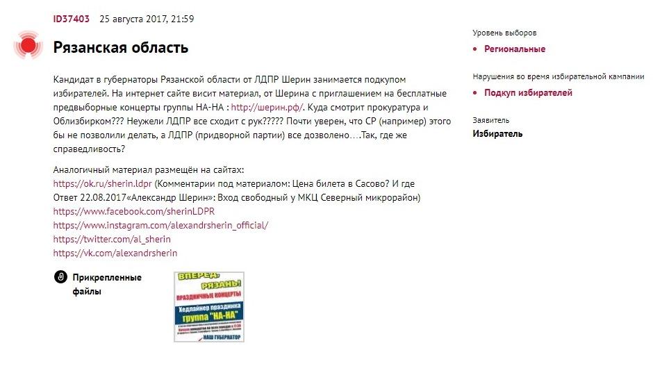 Действительно, 25 августа кандидат в губернаторы от ЛДПР Александр Шерин пожаловался в Избирательную комиссию Рязанской области на частную охранную фирму, сотрудники которой препятствовали распространению агитационных материалов на согласованном пикете рядом с остановкой общественного транспорта. Избирком решил передать жалобу в полицию для проведения проверки и привлечения нарушителей к ответственности. Александр Шерин также сообщил о постоянных проблемах, которые происходят во время поездок по районам Рязанской области. Как только он ставил свой штендер в пределах видимости относительно большого количества людей, к нему подходили полицейские, они пытались прогнать его и его агитаторов. Местные власти, как правило, отказывали Шерину в проведении публичных мероприятий в людных местах. На его странице в соцсети «ВКонтакте» были размещены отрицательные ответы различных районных администраций на уведомления штаба о проведении публичных мероприятий. Там же был и ответ прокуратуры, которая нашла нарушения в действиях одной из администраций. Об этом писали рязанские СМИ. Также Шерин сообщал, что рекламные агентства «Край», «Витта», «Олимп», Russ Outdoor отказывали в размещении его предвыборных материалов.