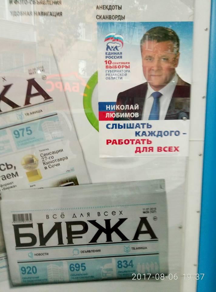 В Рязанской области почти все медийное пространство было занято одним кандидатом — врио губернатора, кандидатом от «Единой России» Николаем Любимовым. Особенно это касается телевидения. Любимов практически ежедневно фигурировал в новостях, как минимум, на двух каналах: «Вести» Рязань и "Край рязанский«—ТКР. Когда 19 июля 2017 года Николай Любимов получил свидетельство о регистрации в качестве кандидата, «Вести» его показали. А когда 21 июля 2017 года свидетельство получала другой кандидат, Александра Перехватова, в «Вестях» о ней не было сказано ни слова. В новостных программах ТКР Н. Любимов может появляться по несколько раз в одной передаче.