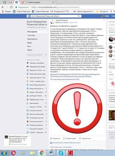 К сожалению, активность «Клуба избирателей Рязанской области» в этом году была направлена не только на создание «положительного образа» выборов губернатора, но и на создание «отрицательного образа» независимых наблюдателей. Так, в день голосования на выборах губернатора Рязанской области, в 09 часов 40 минут в их группе в социальной сети было размещено оповещение, очерняющее работу рязанского «Голоса». Находясь на УИК № 580, около 16 часов координатор рязанского отделения движения «Голос» стала свидетелем того, как одна из молодых наблюдательниц получила на смартфон сообщение, по содержанию похожее на то, что размещено в указанной группе в Фейсбуке. Девушка вслух зачитала сообщение с предупреждением об опасности, якобы исходящей от «Голоса», другим наблюдателям, а затем показала его председателю и секретарю УИК. Полагаем, что это была целенаправленная акция по дискредитации. Информация в группе исходила от администратора группы Сергея Петрова (по аккаунту которого не понятно, это реальный человек или фейк). А курирует группу Александр Семенов, руководитель Клуба, политолог, преподаватель, эксперт Избирательной комиссии Рязанской области. В размещенном сообщении не содержится ни одного факта. Тем не менее, лживая информация масштабно тиражировалась молодым наблюдателям. Считаем такие действия, курируемые экспертом Избирательной комиссии Рязанской области, недопустимыми.