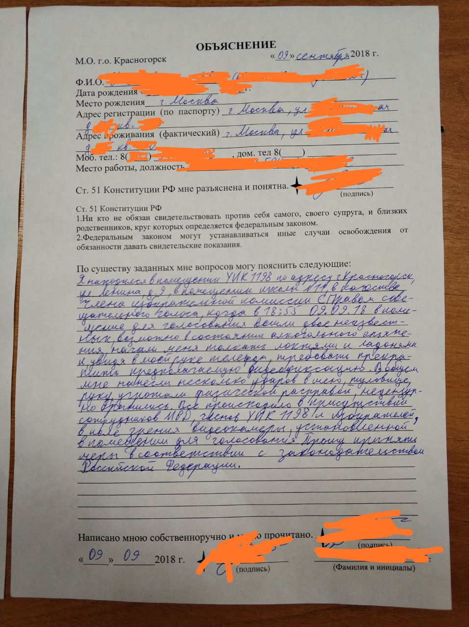 В подмосковном Красногорске произошел случай нападения на члена комиссии от «Яблока». В 18:55 на УИК 1198 ворвались двое неизвестных и начали толкать ладонями и локтями девушку — члена комиссии. Она производила съемку на телефон, увидев это, злоумышленники пригрозили физической расправой и нанесли несколько ударов в шею, руки и тело девушки. Действия происходили при сотруднике МВД и членах избирательной комиссии, избирателях. Девушка написала заявление в полицию, правонарушители были задержаны для дачи показаний. Один из нападавших написал встречное заявление в полицию: якобы его оскорбляли.